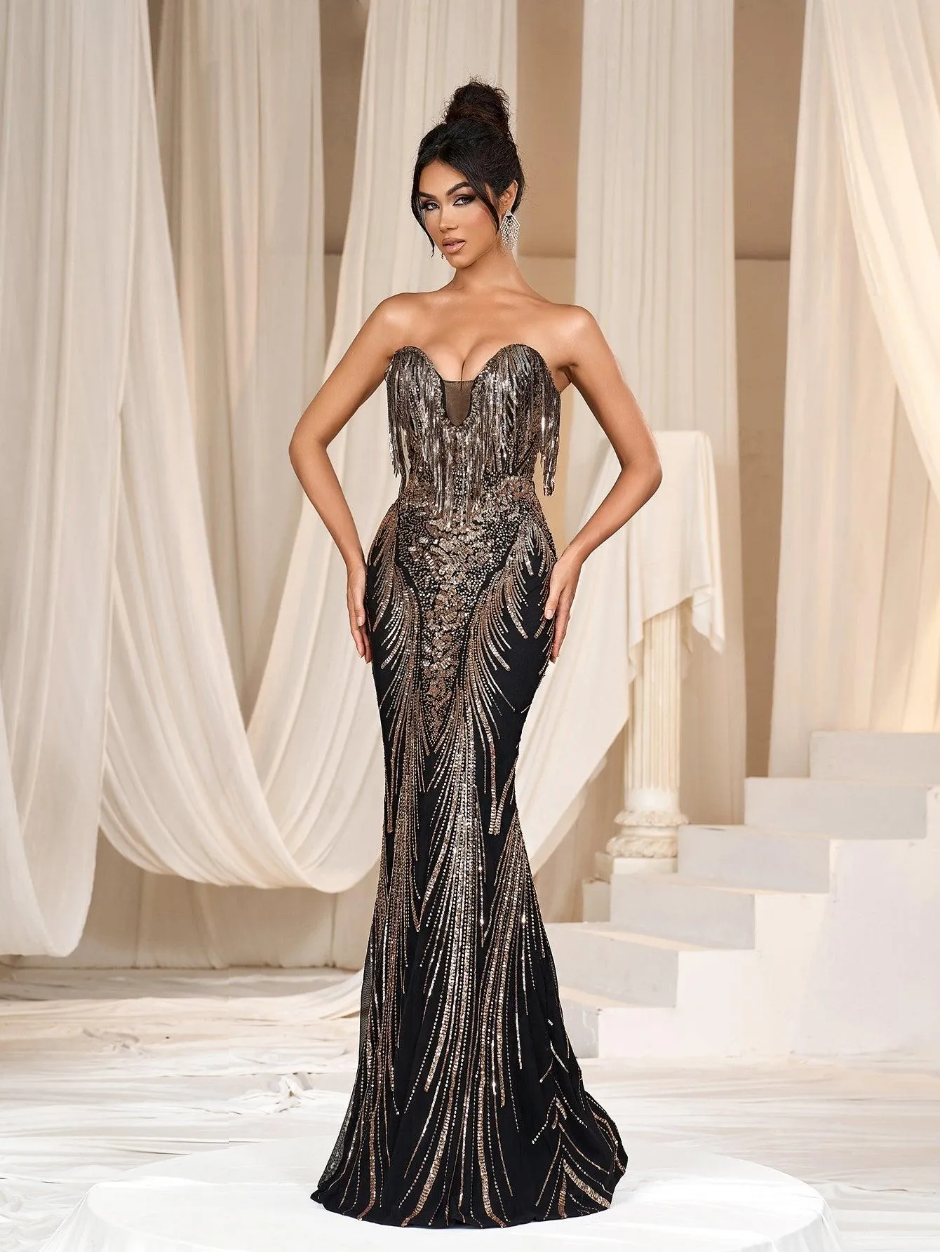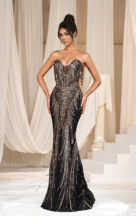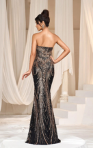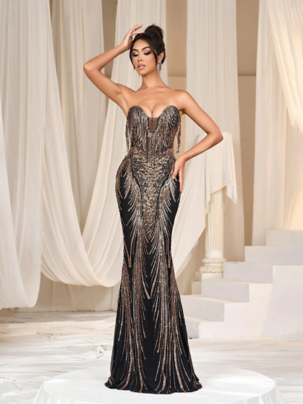 This strapless creation features a dramatic sweetheart neckline that flows into a meticulously beaded bodice. Cascading sequins draw the eye along the curve-hugging silhouette, down to a mermaid train that sweeps behind with the quiet authority of a moonlit tide.Strategically placed beaded fringe adds a dynamic edge, creating a sense of movement that echoes the silent music of the cosmos. The gown’s back is a smooth expanse of sequins, with the patterns wrapping around to complete the celestial story started in the front.This gown is a piece of wearable art for the woman who is as mysterious and untouchable as the night sky, perfect for galas, black-tie events, or any evening where glamour is not just desired, but required.