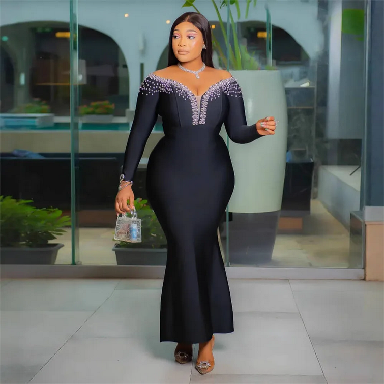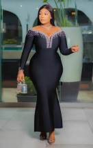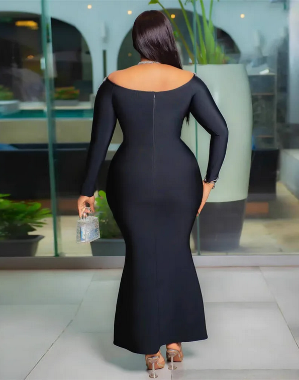 Step into timeless elegance with our black bandage dress featuring a stunning off shoulder neckline adorned with luxurious 3D alloy gemstone crystals. The dress boasts a sleek silhouette that accentuates your curves effortlessly, while the fishtail bottom adds a touch of allure and sophistication. Perfect for formal occasions, evening events, or cocktail parties, this dress is a must-have for those who appreciate classic style with a modern twist. Elevate your wardrobe with this chic and versatile piece that exudes grace and refinement.